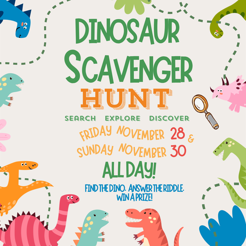 Celebrate with us all day on Friday, November 28th and Sunday, November 30th with a Dinosaur Scavenger Hunt! Find the dinos. Read the clues. Decode the riddle. Win a prize. Perfect for ages 3 and up.