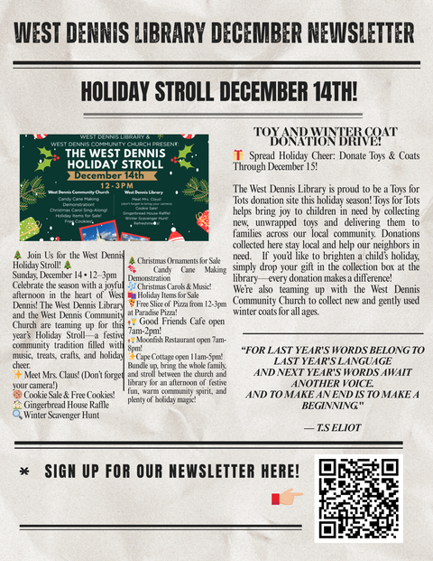 Celebrate the season with a joyful afternoon in the heart of West Dennis! The West Dennis Library and the West Dennis Community Church are teaming up for this year’s Holiday Stroll—a festive community tradition filled with music, treats, crafts, and holiday cheer.